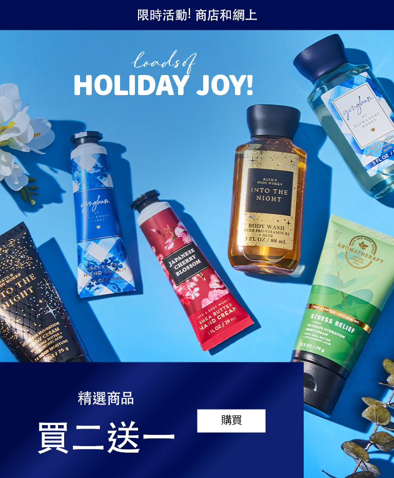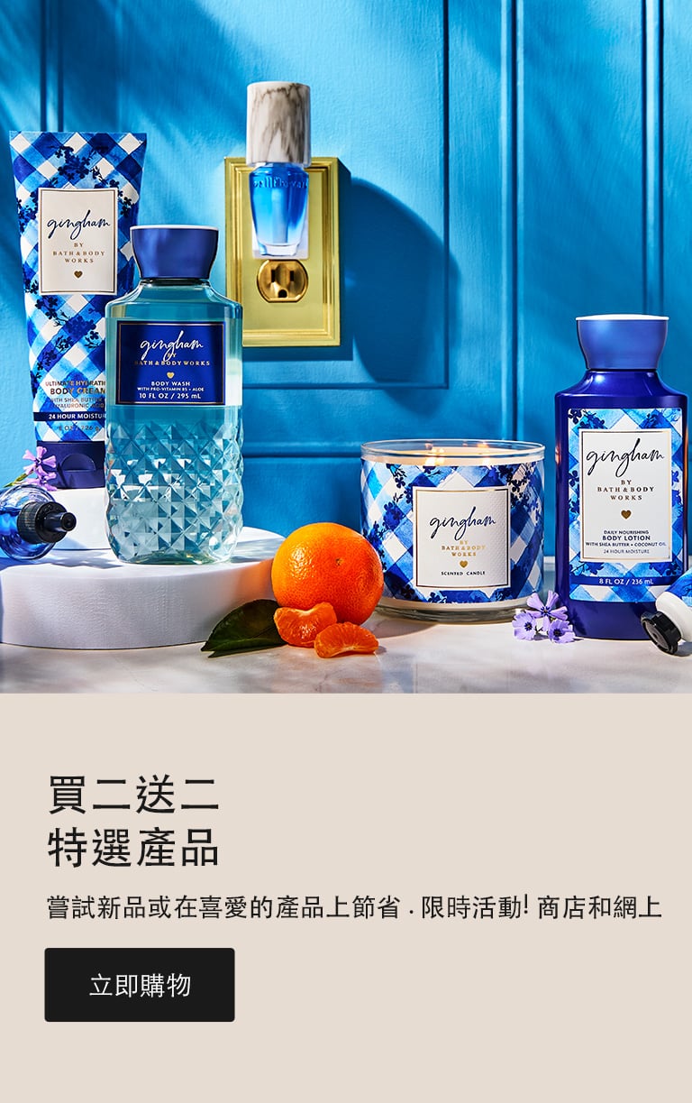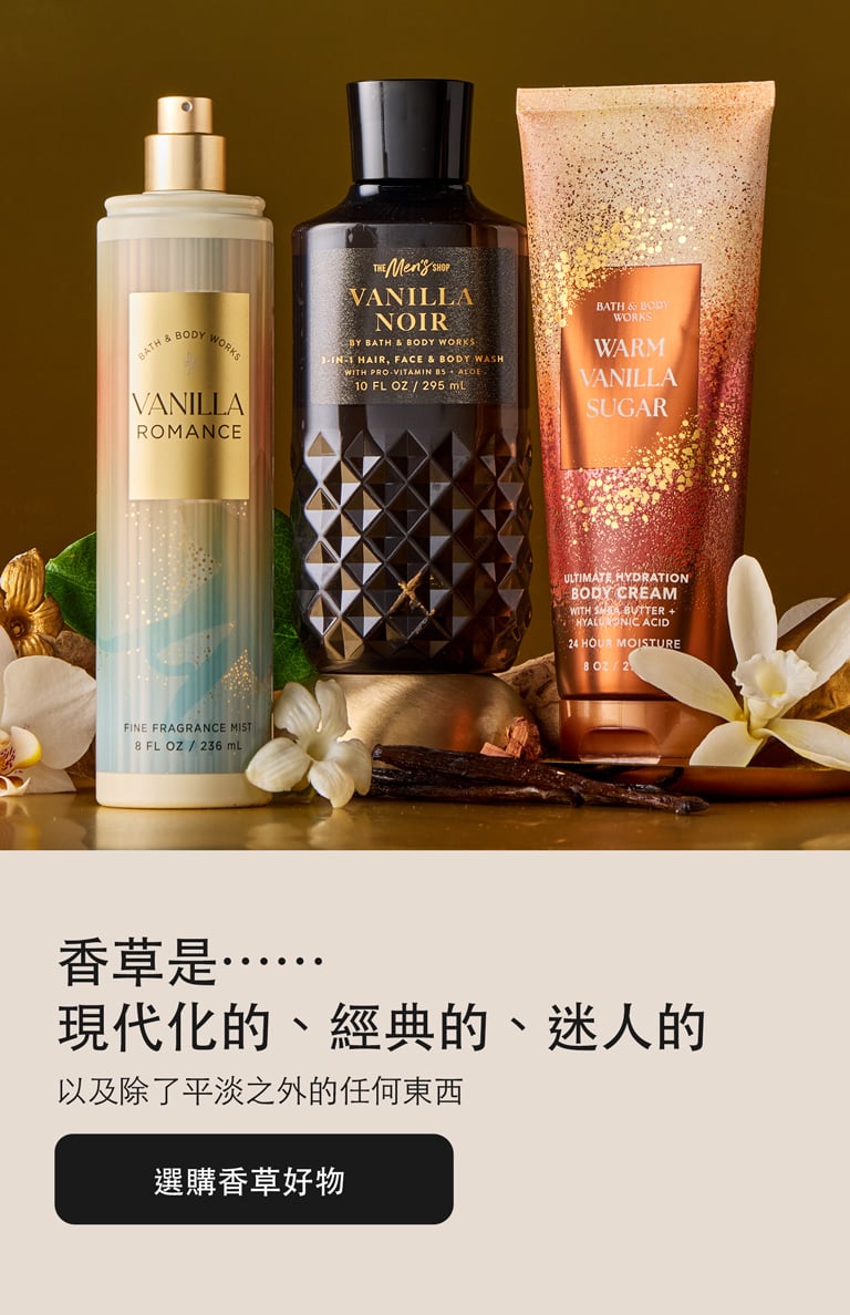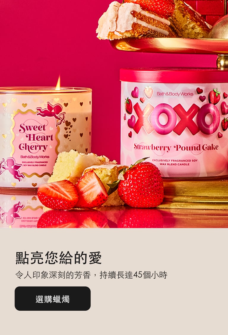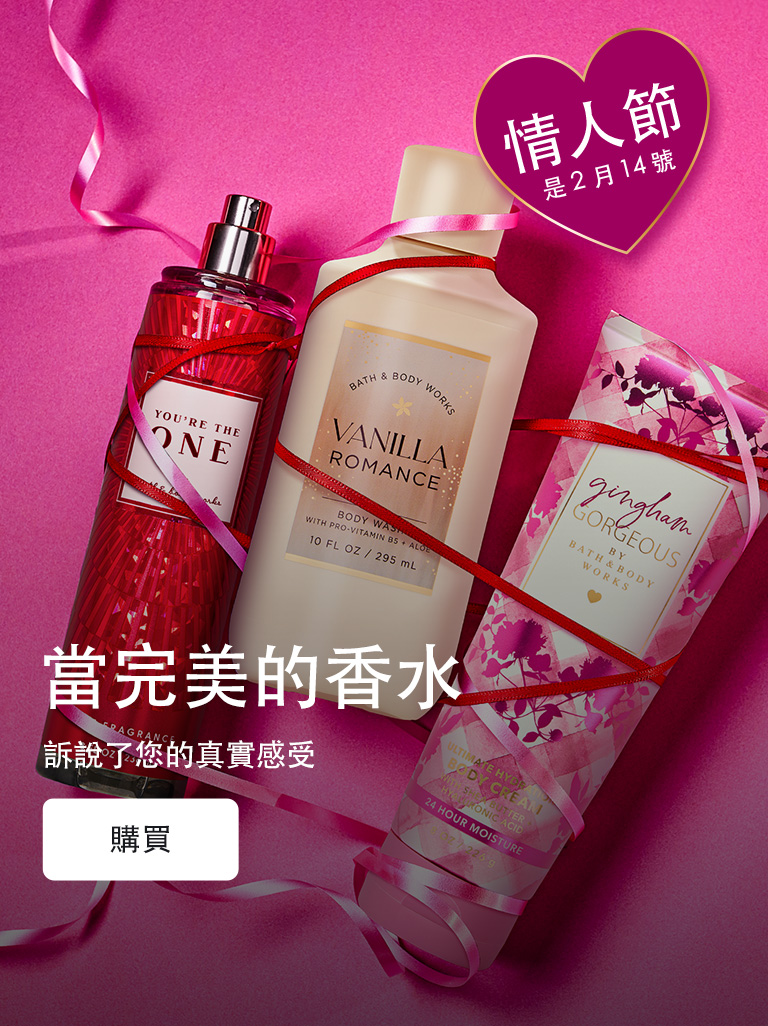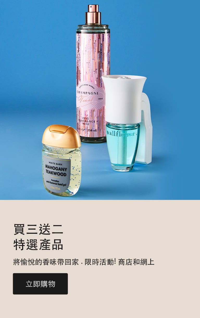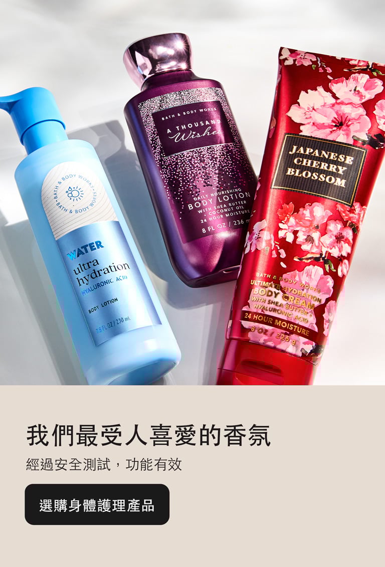Bath and Body Works 是您購買 禮物和令人驚喜和愉悅的好東西。從清新的香水到舒緩的皮膚護理,我們讓您找到完美的特別的東西成為快樂的回憶體驗。哦!當您瀏覽時,請購買我們最新、精選的 乳液、 肥皂 和蠟燭!