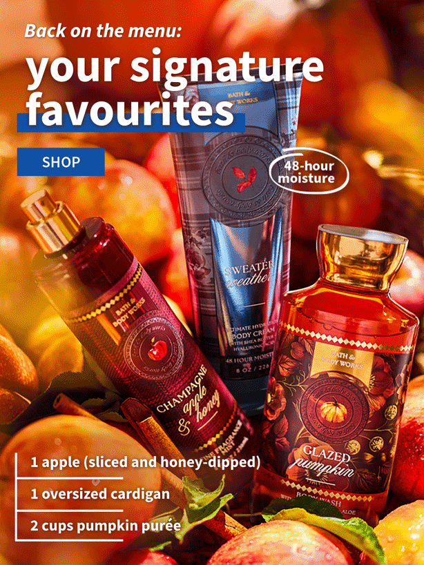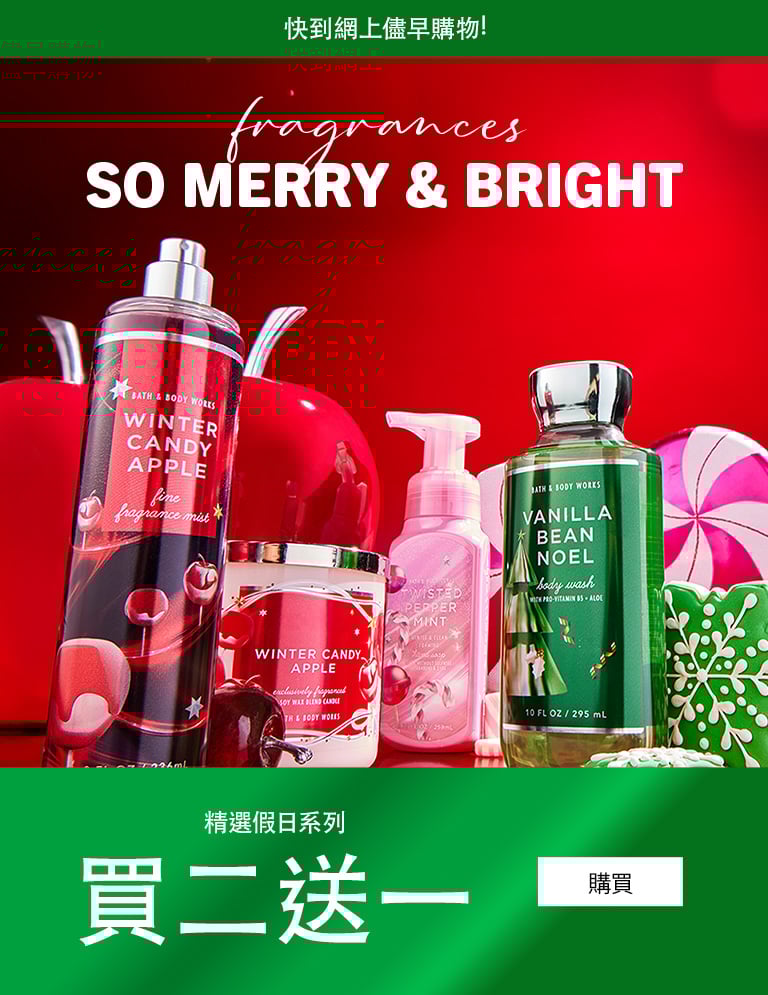 Bath and Body Works 是您購買 禮物和令人驚喜和愉悅的好東西。從清新的香水到舒緩的皮膚護理,我們讓您找到完美的特別的東西成為快樂的回憶體驗。哦!當您瀏覽時,請購買我們最新、精選的 乳液、 肥皂 和蠟燭!