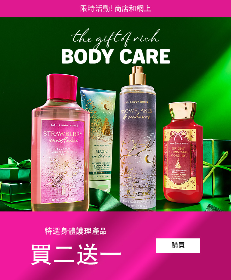 Bath and Body Works 是您購買 禮物和令人驚喜和愉悅的好東西。從清新的香水到舒緩的皮膚護理,我們讓您找到完美的特別的東西成為快樂的回憶體驗。哦!當您瀏覽時,請購買我們最新、精選的 乳液、 肥皂 和蠟燭!