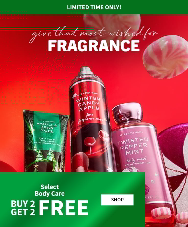Bath and Body Works is your go-to place for gifts & goodies that surprise & delight. From fresh fragrances to soothing skin care, we make finding your perfect something special a happy-memory-making experience. Oh! And while you're browsing, shop our latest & greatest selection of lotions, soaps and candles!