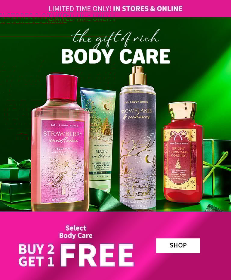 Bath and Body Works is your go-to place for gifts & goodies that surprise & delight. From fresh fragrances to soothing skin care, we make finding your perfect something special a happy-memory-making experience. Oh! And while you're browsing, shop our latest & greatest selection of lotions, soaps and candles!
