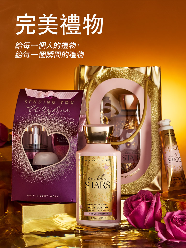 Bath & Body Works 可幫你找到適合各種場合的完美禮物。給她的禮物、給他的禮物——我們有各種送禮佳品,讓收到禮物的人感到自己身分特別。需要生日禮物嗎?我們有個好主意!吃完蛋糕後,給喜歡香氣的生日女孩或男士送上他們真正想要的蠟燭——他們最喜歡的三芯蠟燭!愛神隨時都可能會出現放箭!瞄准情人節禮物,為你最親密和最親愛的女生男生送上最熱門的香水。想找母親節禮物?我們的 DIY 禮品包和香氣禮品套裝是很好的選擇。送上媽媽最喜歡的家用香氣和滋養皮膚的身體護理產品,她一定會大受感動。是時候為父親節禮物增添驚喜了!不再送父親節領呔,改送父親節香氣套裝吧。爸爸已經有很多領呔了——他值得擁有他最喜歡的香味!在我們的C.O. Bigelow或Bath & Body Works Men’s選購男士禮品系列。祝你聖誕快樂!如果有來自 Bath & Body Works 的季節性香氣,一年中最美妙的時光定會不一樣。在朋友的聖誕禮襪裏塞滿帶來歡欣的熱門產品,並把我們最優秀的身體護理和家庭香氛產品放在聖誕樹旁。在我們的聖誕禮物指南中找更多節日靈感吧。說到假期,我們的復活節禮物同樣能帶給你驚喜!用以上的產品裝滿家人朋友的禮籃,他們必定會高興得手舞足蹈。結婚禮物?當然有!新娘最愛的香氣來了!周年紀念禮物?我們也有!我們更有屬於新居入伙的香氣產品——牆上香氛!——讓每個房子都有家的感覺。
